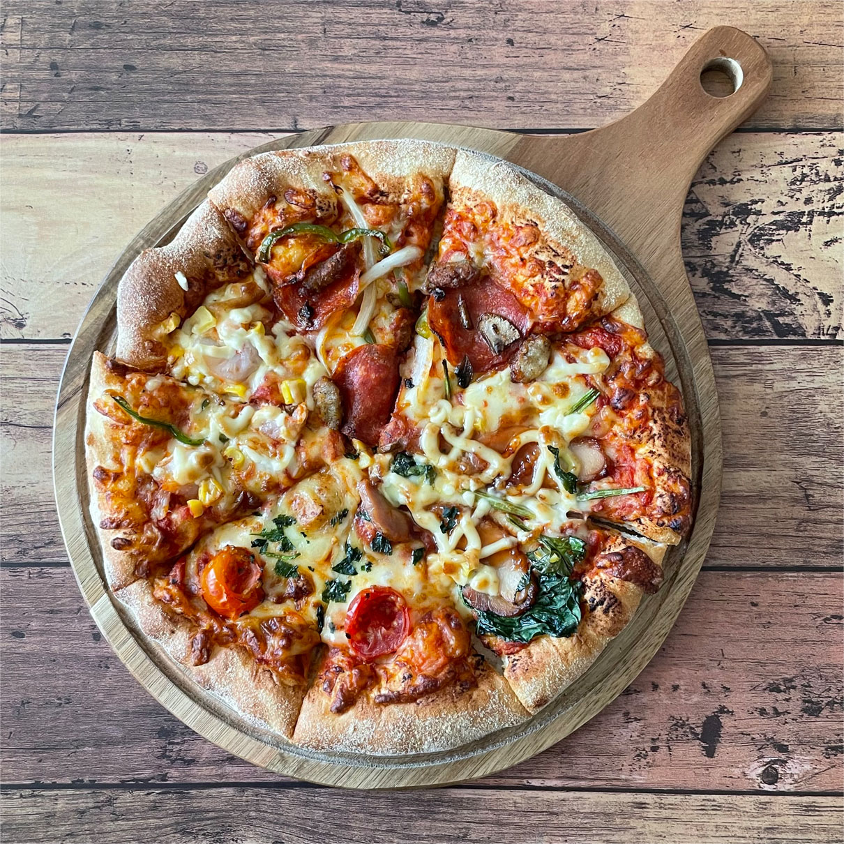 マルゲリータや照り焼きチキンなど4種類の味が楽しめる1枚です。
