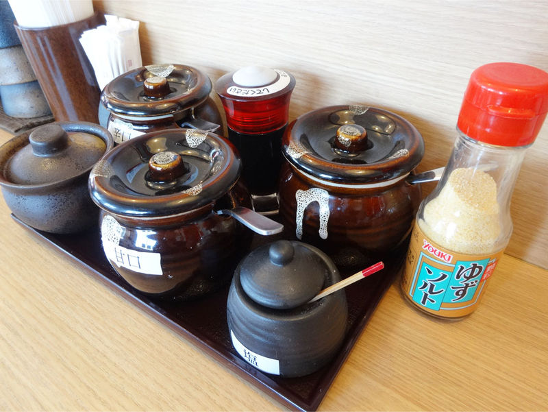 甘口ソース・辛口ソース・ピンクロックソルト・そして持参したゆずソルト