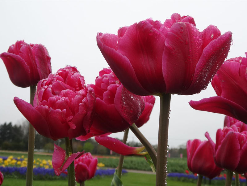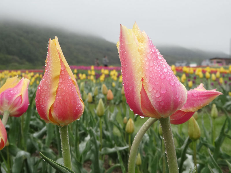 あいにくな天気でしたが、山の方には靄がかかっていて、霧雨の影響でチューリップにも