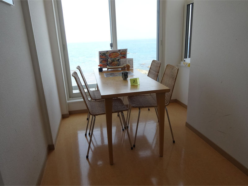 店内から海を見て潮風に当たりながら海の幸を頂く