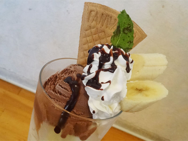 母の注文したチョコバナナパフェは、バニラアイスとチョコアイスが入っていて、生クリームにバナナ