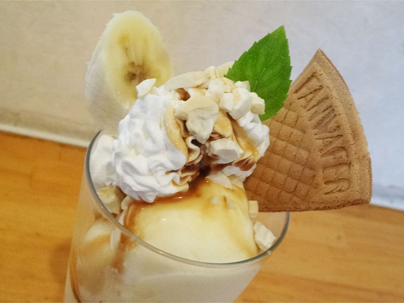 私の注文したキャラメルナッツパフェは、バニラアイス2コと生クリームにバナナ
