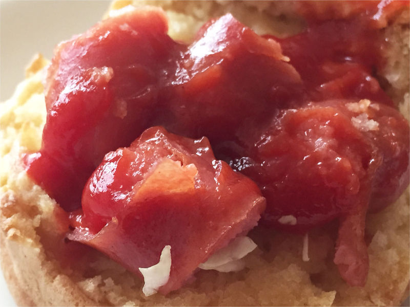 こちらはチーズおやきを半分に割って、中にウインナーを入れてケチャップをかけたものです♪