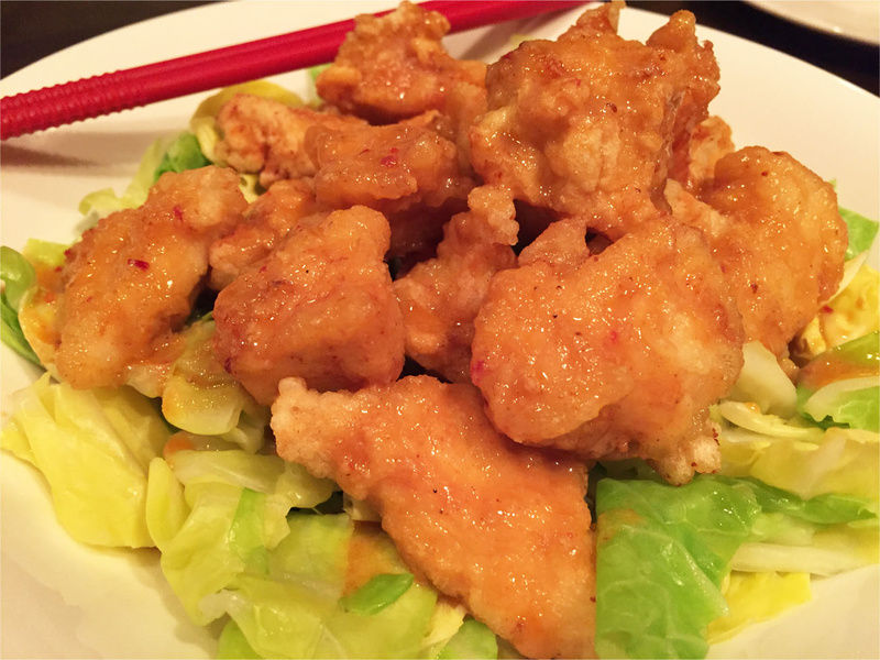 鶏肉の揚げもの・ピリ辛ゴマソースかけ春キャベツ添え