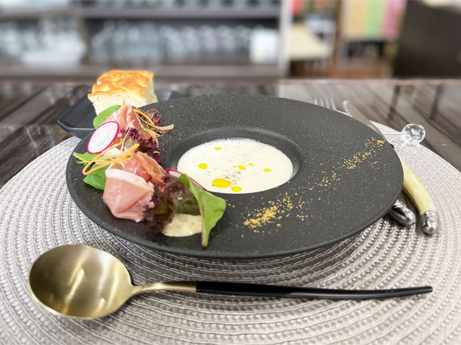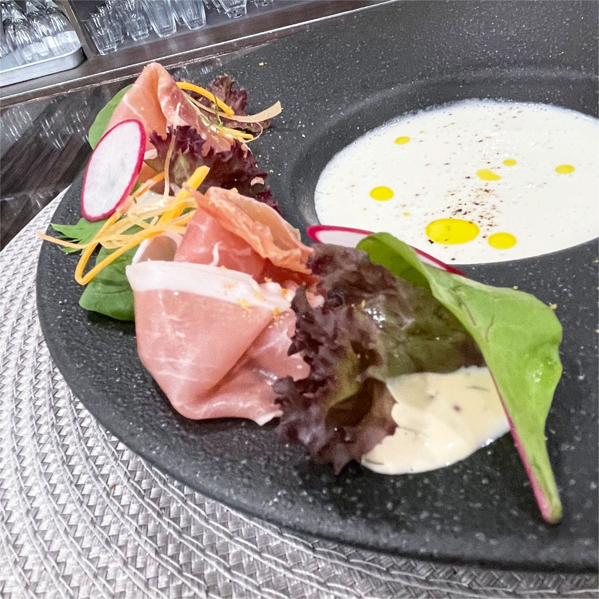 とうもろこし(ホワイトショコラ)の冷製スープ・生ハムのサラダ