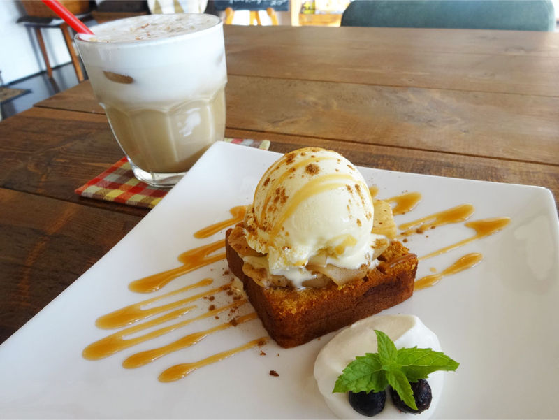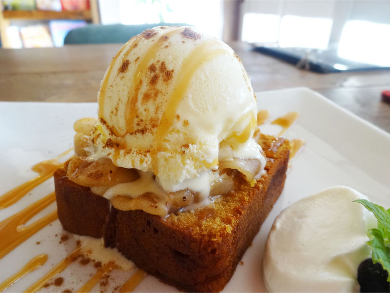 あたためたキャラメルパウンドとりんごの上にバニラアイスを乗せたもの。