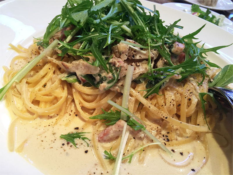 ゴボウとホウレン草のリングイネ・カルボナーラ風水菜のサラダ添え