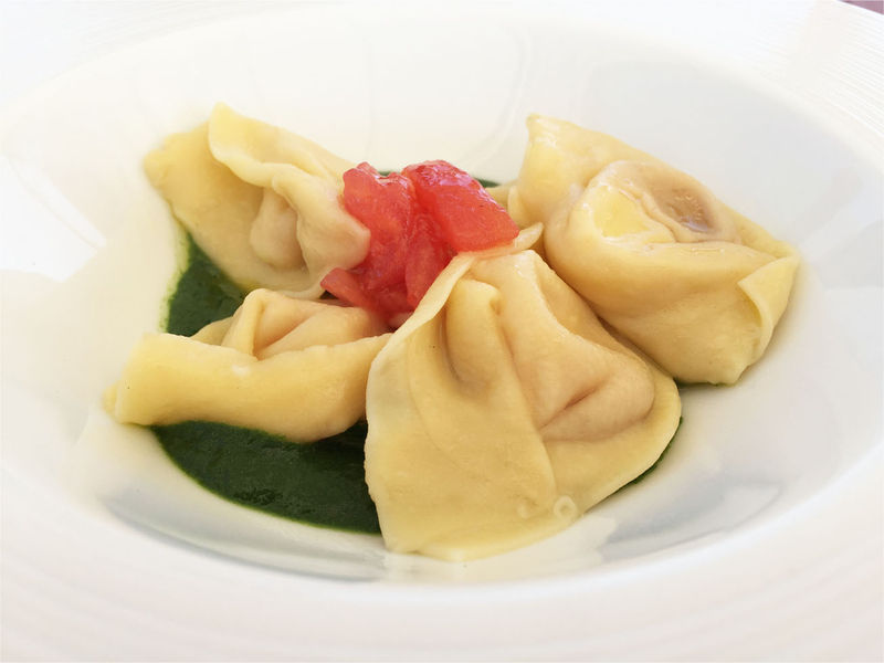 ラズベリーとモッツァレラを詰めたトルテッリ(ソースはバジルとほうれん草)