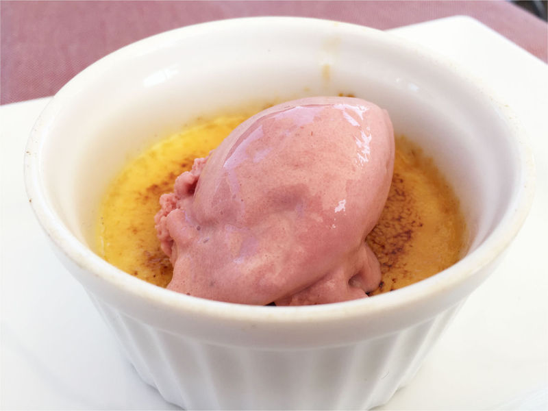 甘いクレムブリュレの上にはラズベリーのジェラート!