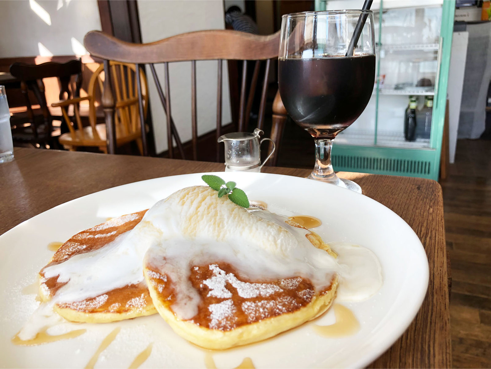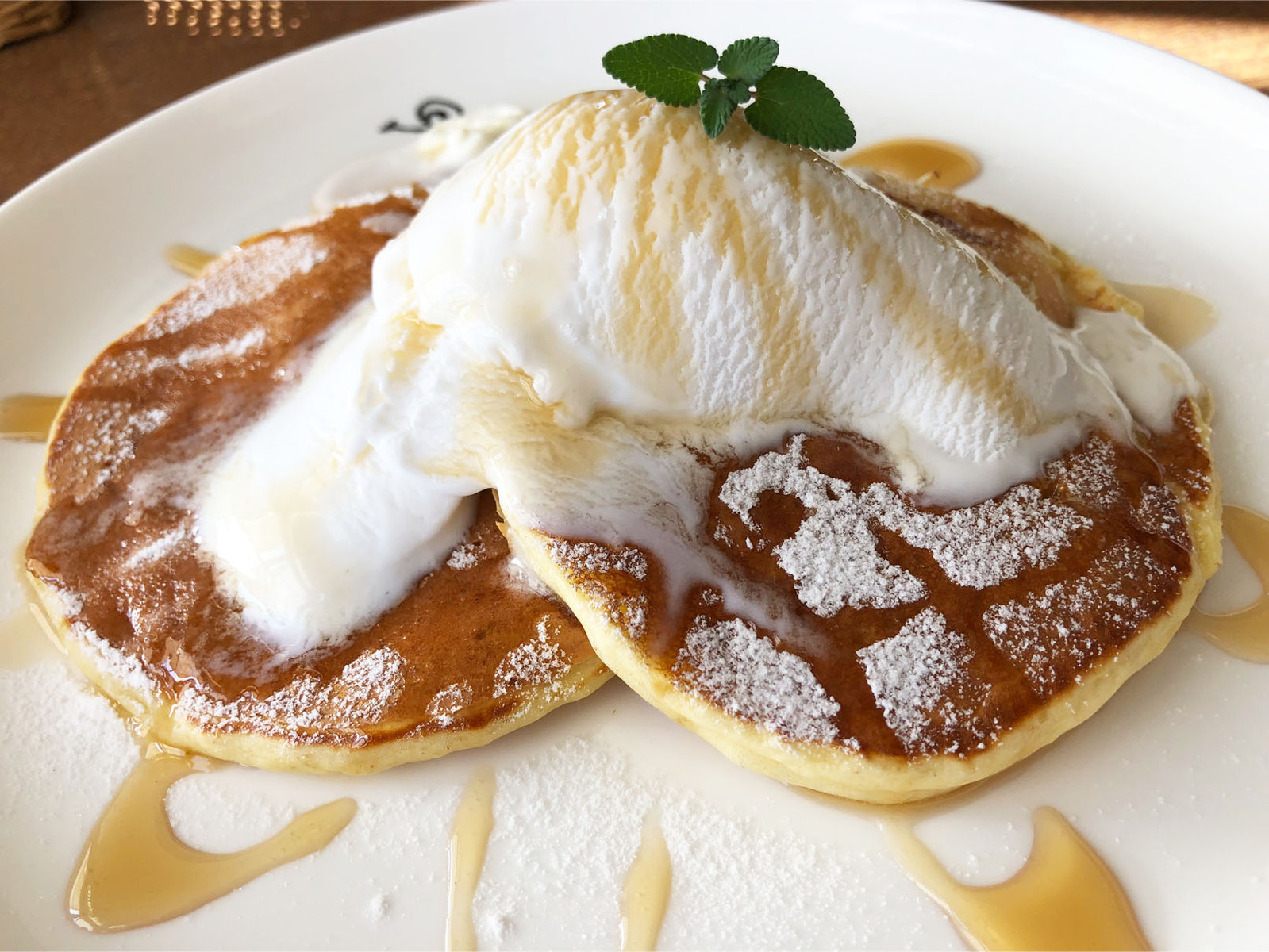 ふわふわのパンケーキ3枚の上にメープルシロップと、冷た~いココナッツアイスが