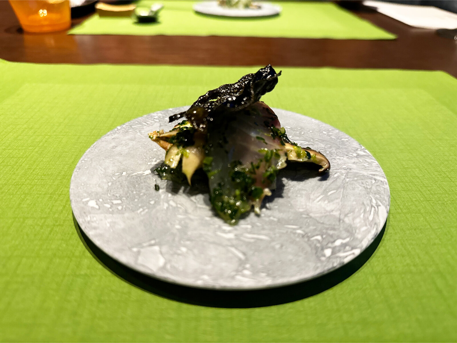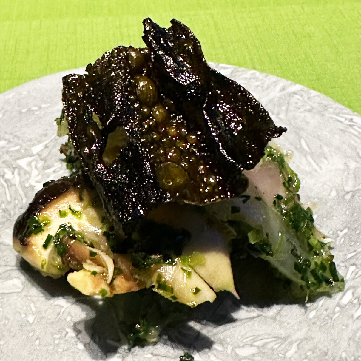 真鯛の昆布締めと原木椎茸のニラ和え