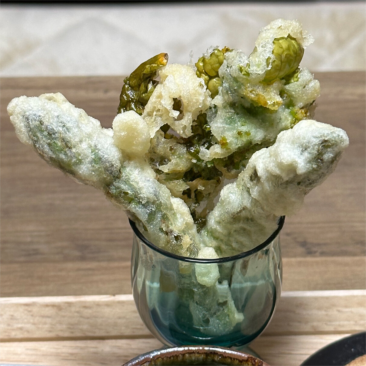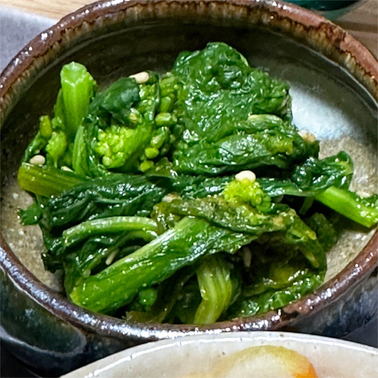 油で揚げて醤油ベースの餡をかけました。上には菜の花