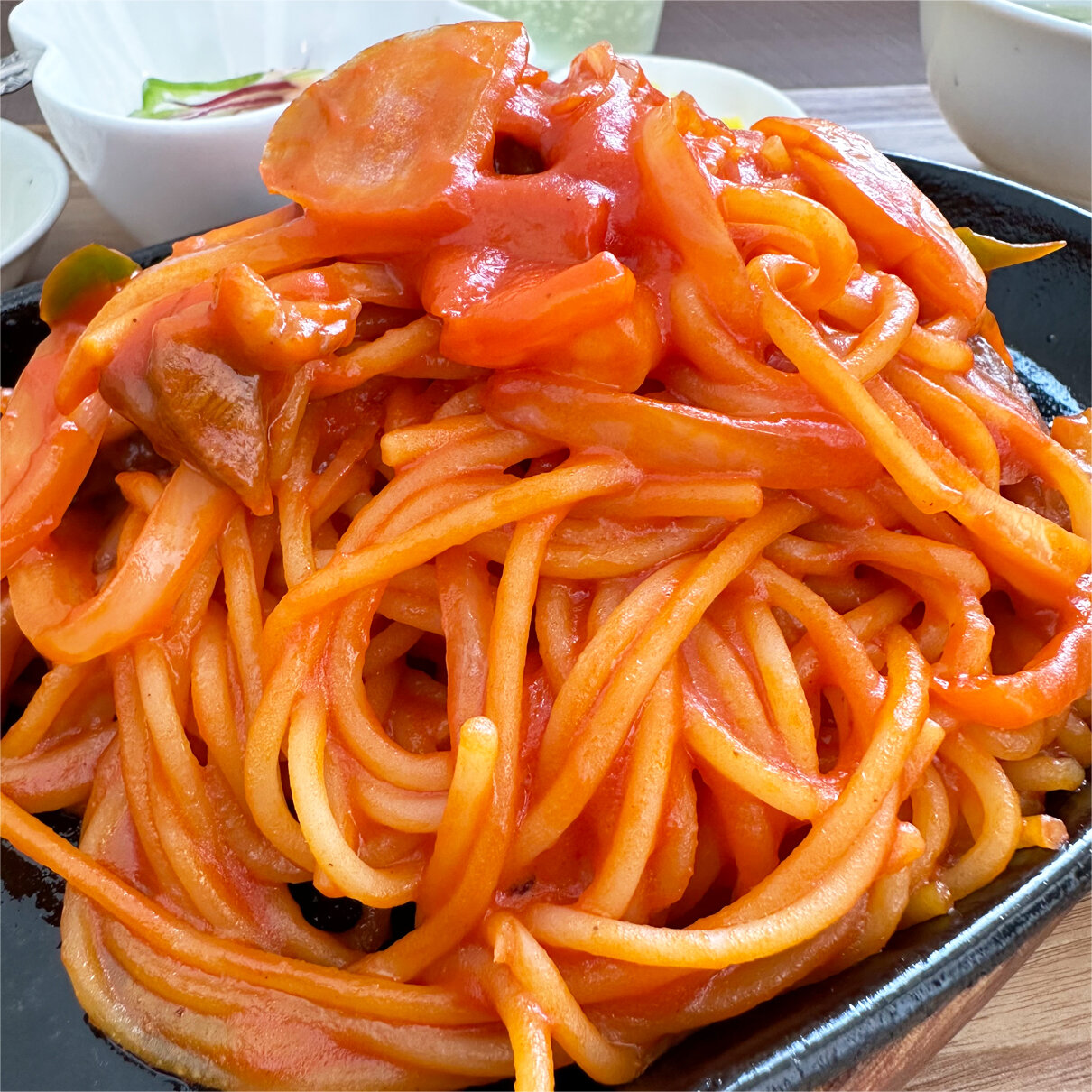 パスタの太さ、ケチャップの酸味、たっぷりのケチャップ、鉄板提供。
