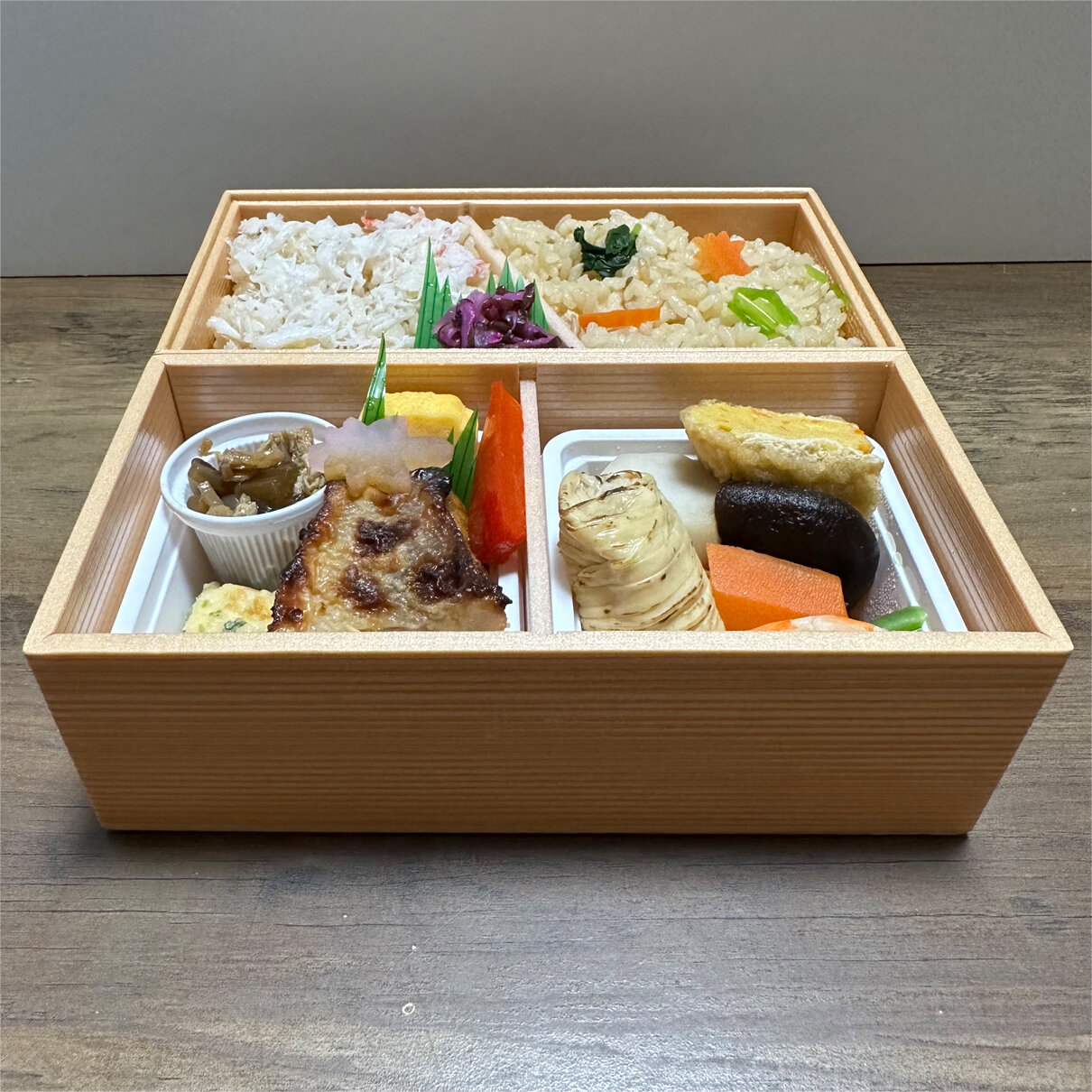 赤魚西京焼、南瓜しんじょあおさ揚げ、厚焼玉子、蕗、木耳、つき蒟蒻、油揚げ煮