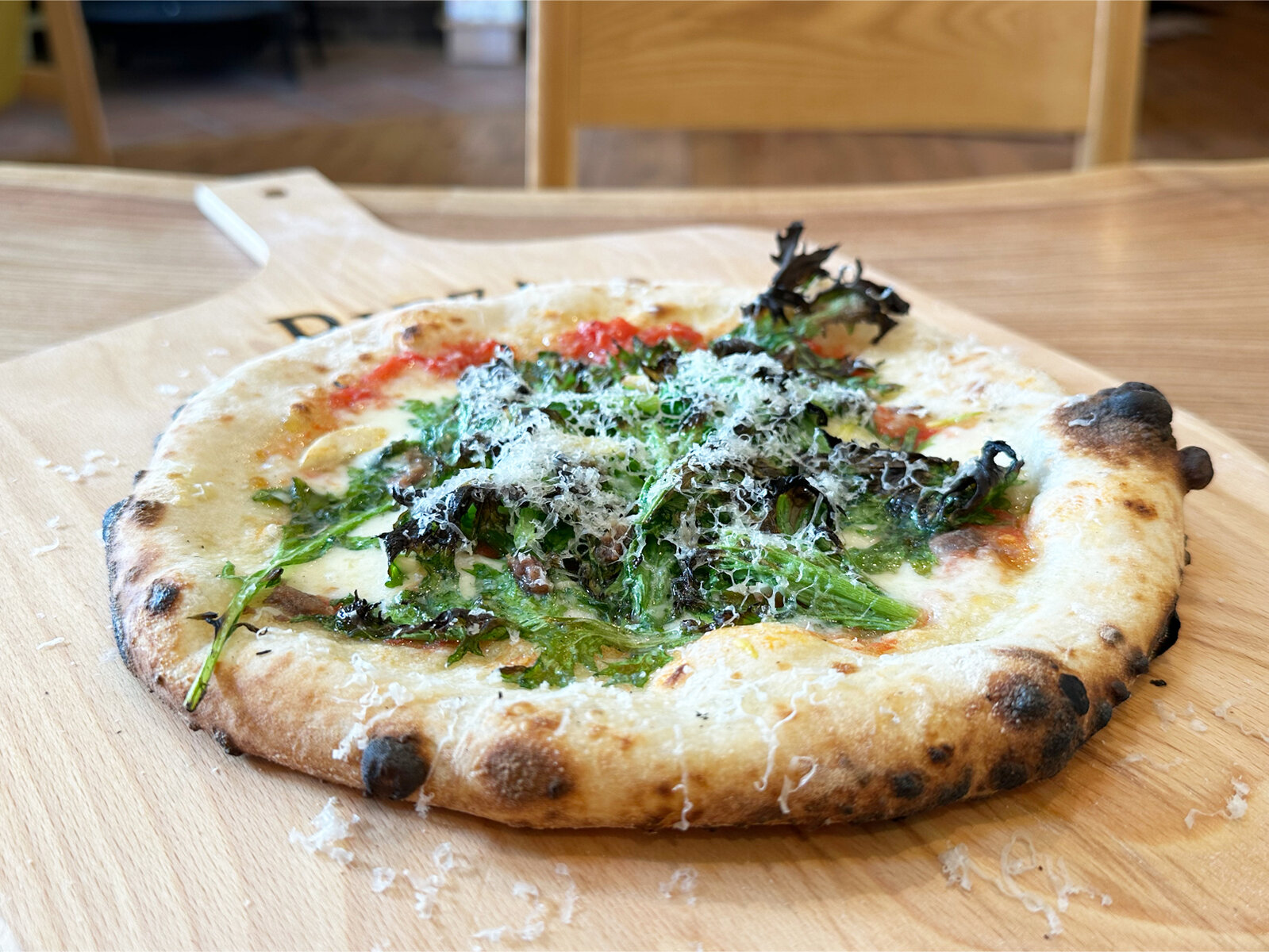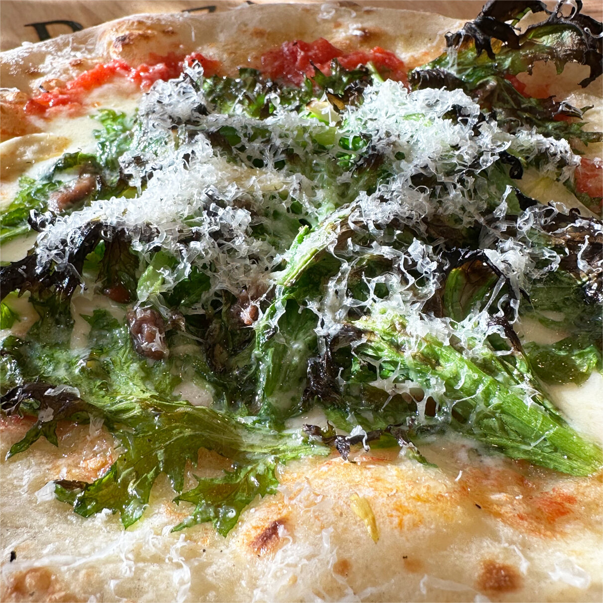 ベースはトマトソースで、たっぷりのわさび菜が乗ったとっても美味しいピッツァ。