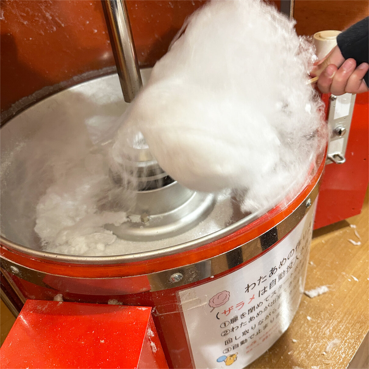 ボタンを押すと自動的にザラメが入り、後は割りばしでクルクル巻くだけ。