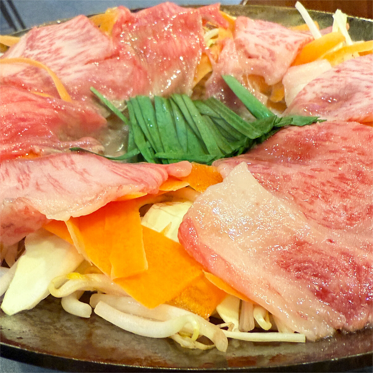 専用の平たい鍋に野菜が入り、その上にお肉が乗り、出汁で炊き上げます。