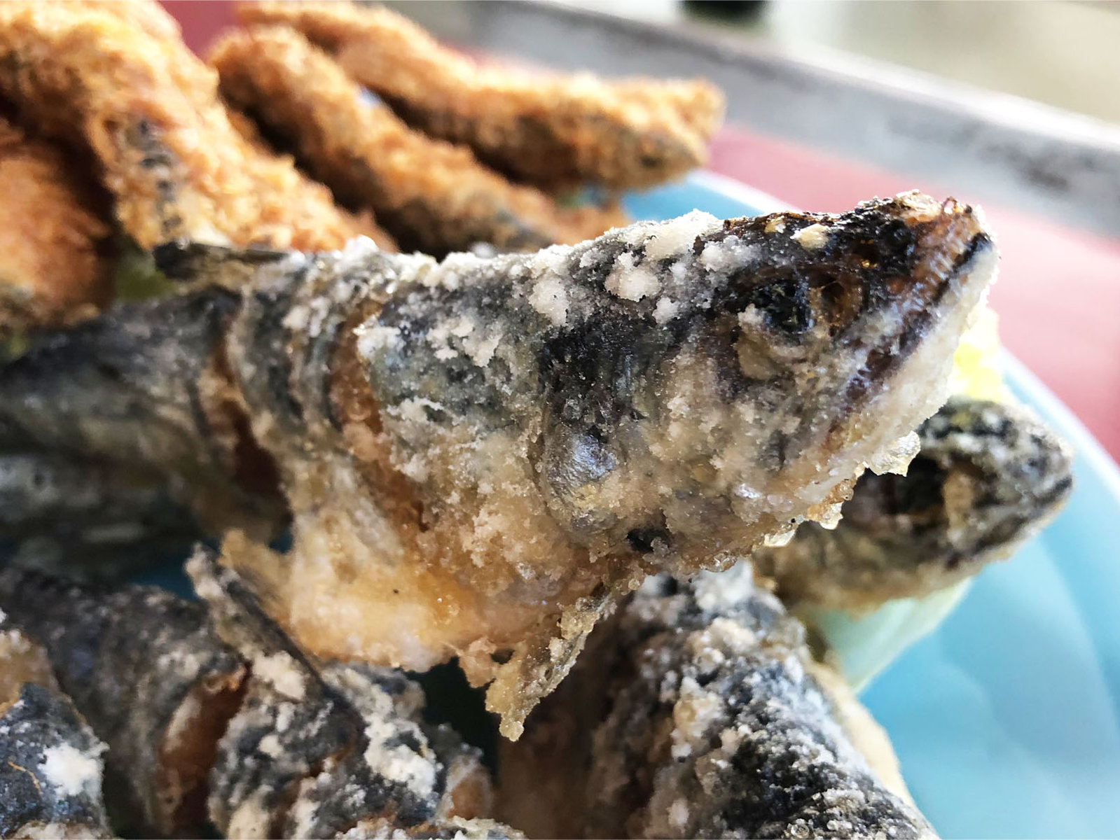 唐揚げもフライも頭からしっぽまで丸々頂けます。