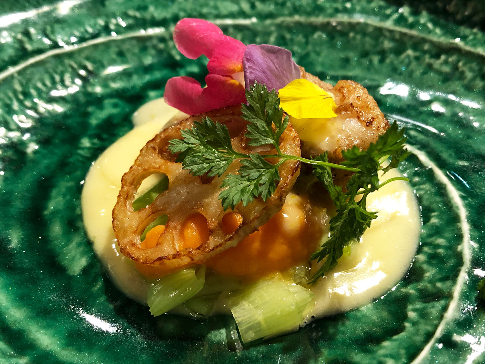 ソテーされたあんこうに、西洋ネギ、ポワロ(リーキ)と上には素揚げした蓮根。