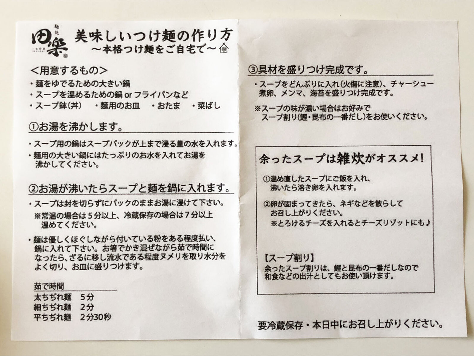 麺は自宅で茹でます。茹で時間など作り方を書いた紙が入ってます。