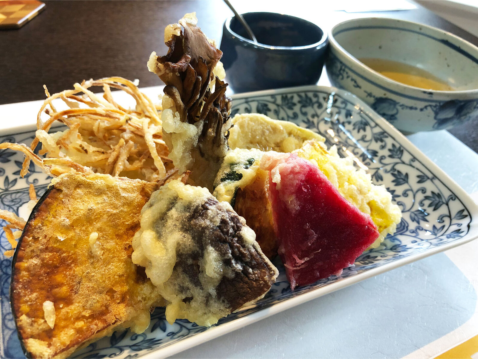ビーツ、カボチャ、舞茸、ズッキーニ、牛蒡のかき揚げ、ナス