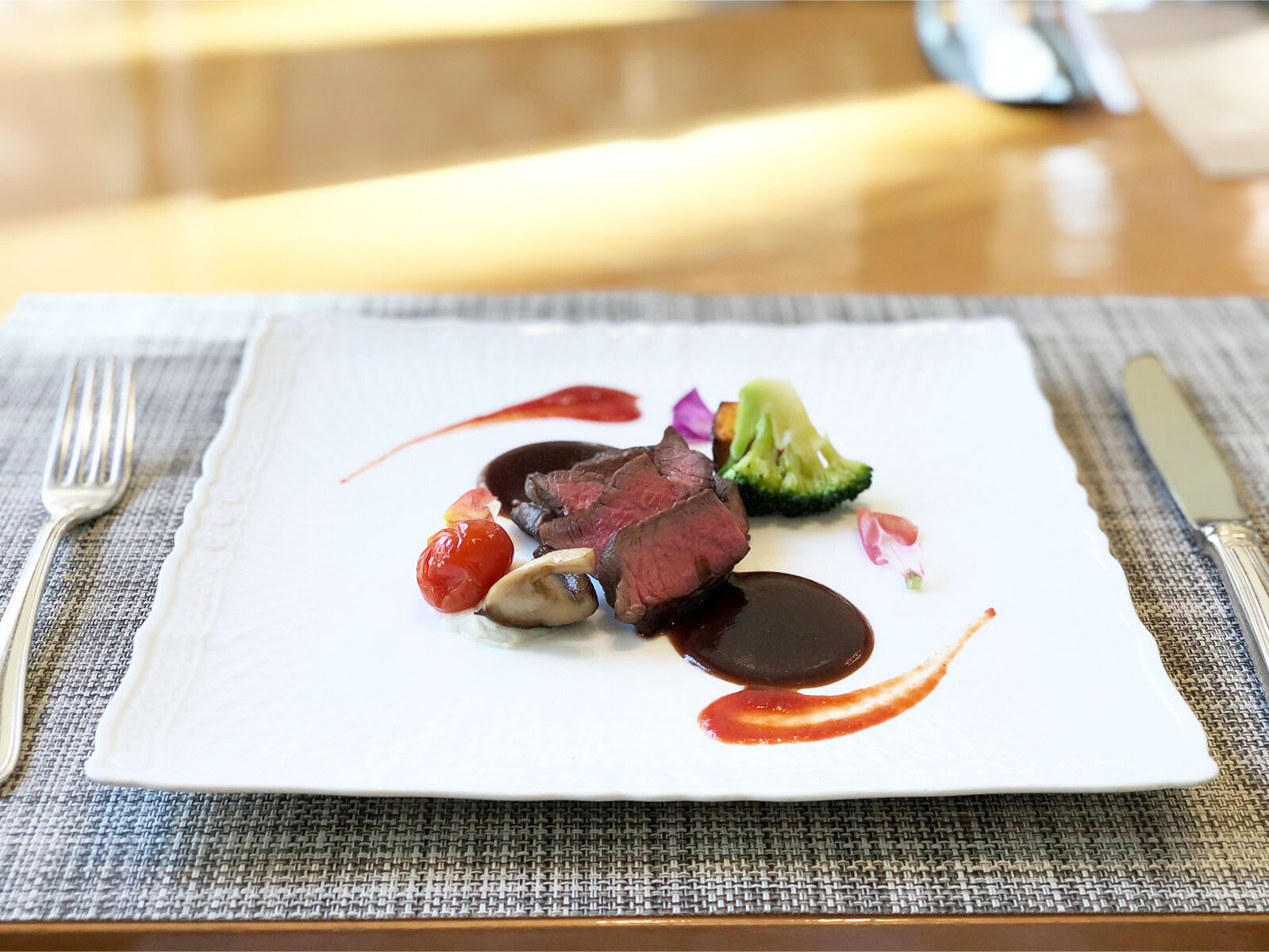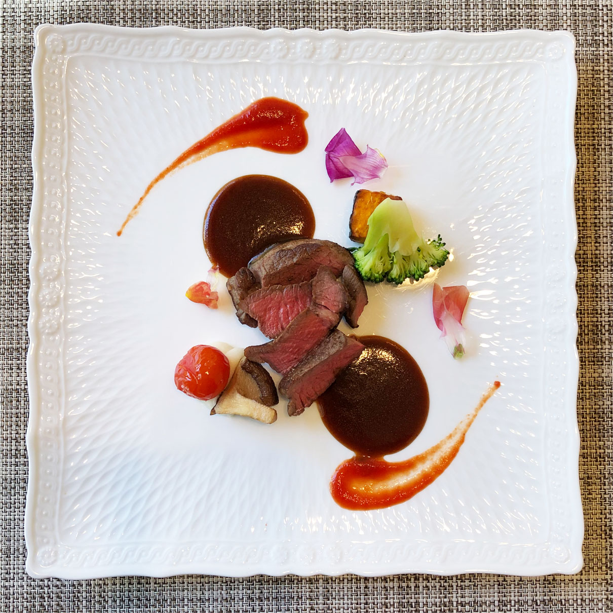 十勝産牛(十勝若牛)の薄切りステーキと彩り野菜(バルサミコ酢のソースとトマトソース)