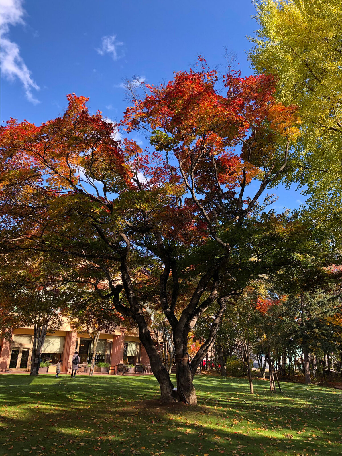 この日は晴天で、空の青、芝や木々の緑、紅葉の赤、黄色と