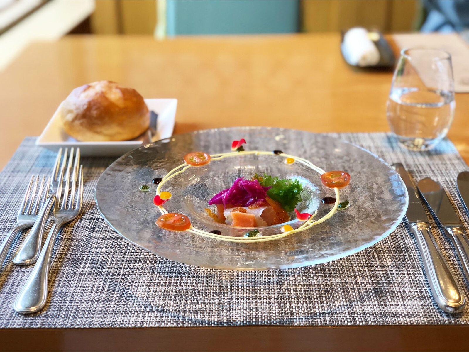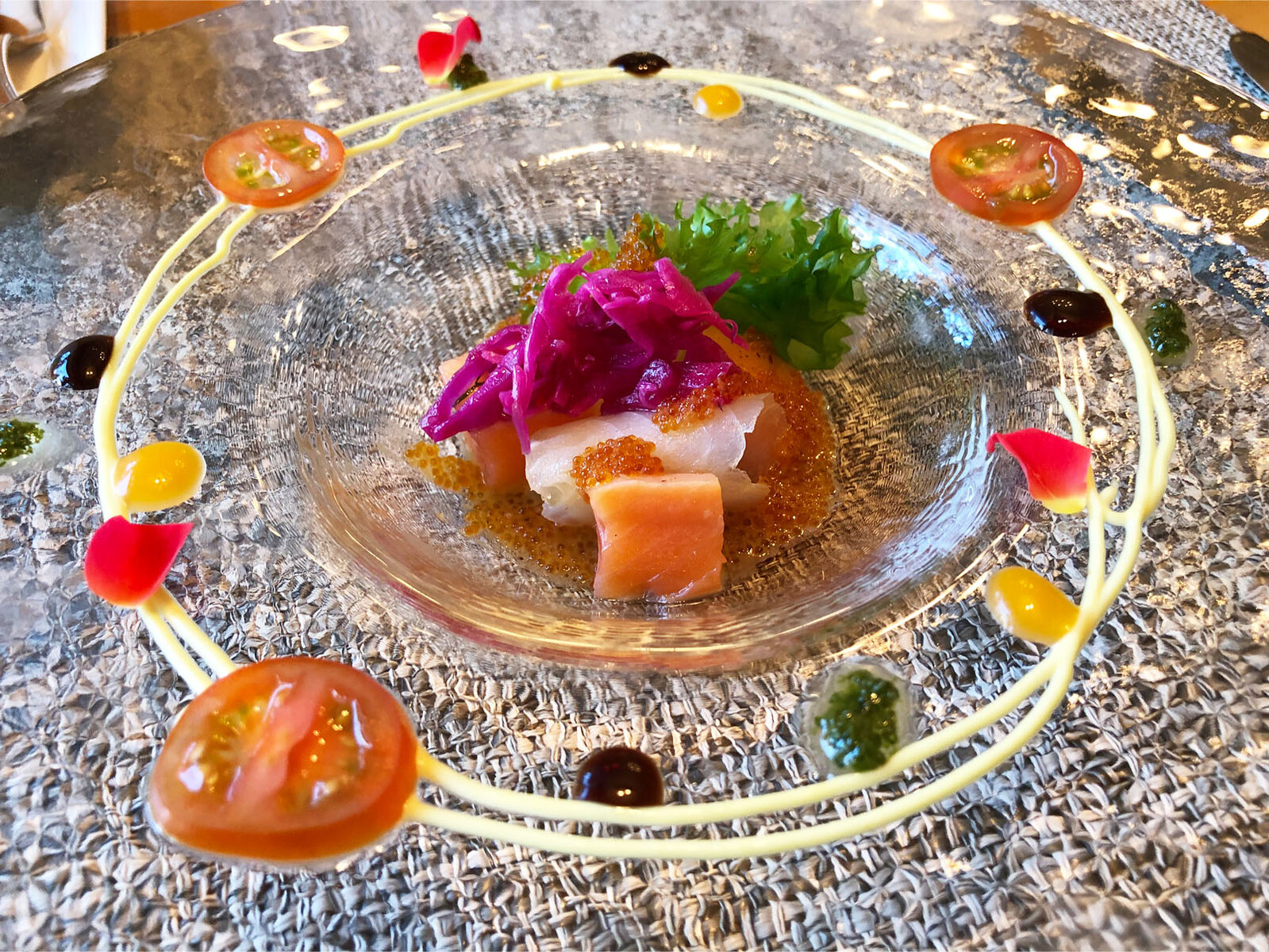 マリネサーモンといずみ鯛のスモークの前菜仕立て(トビッコソース)