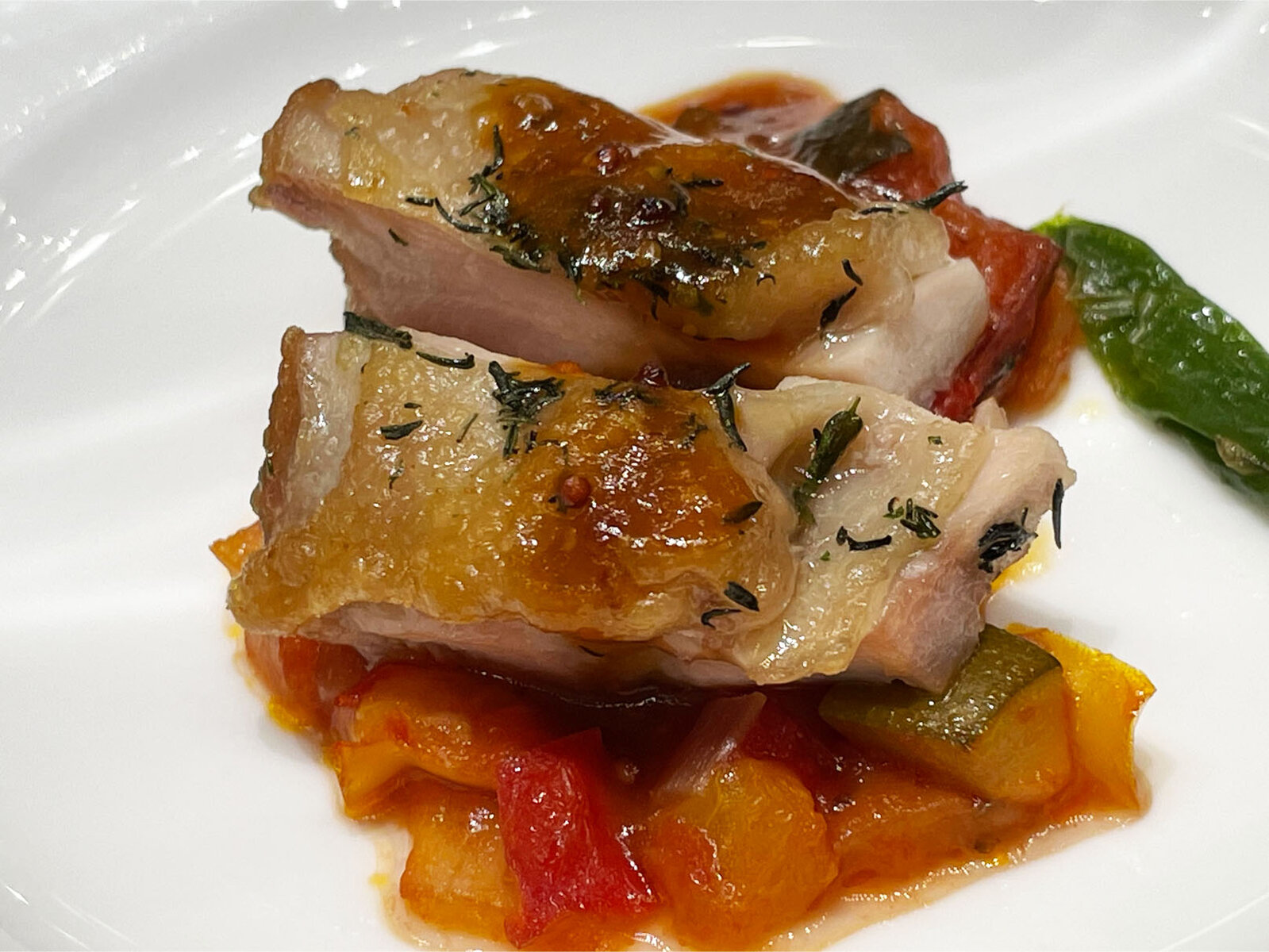 香ばしく焼き上げた鶏肉の下にはラタトゥイユが敷かれています。