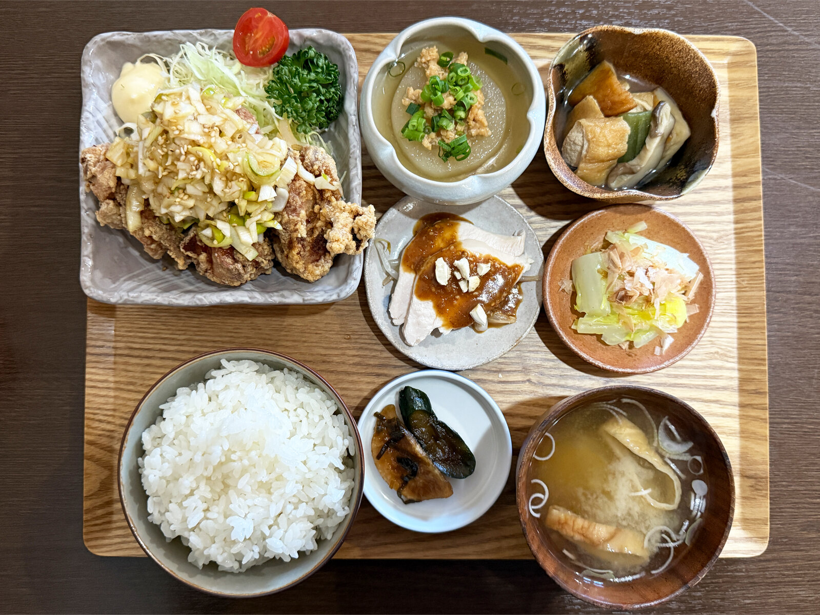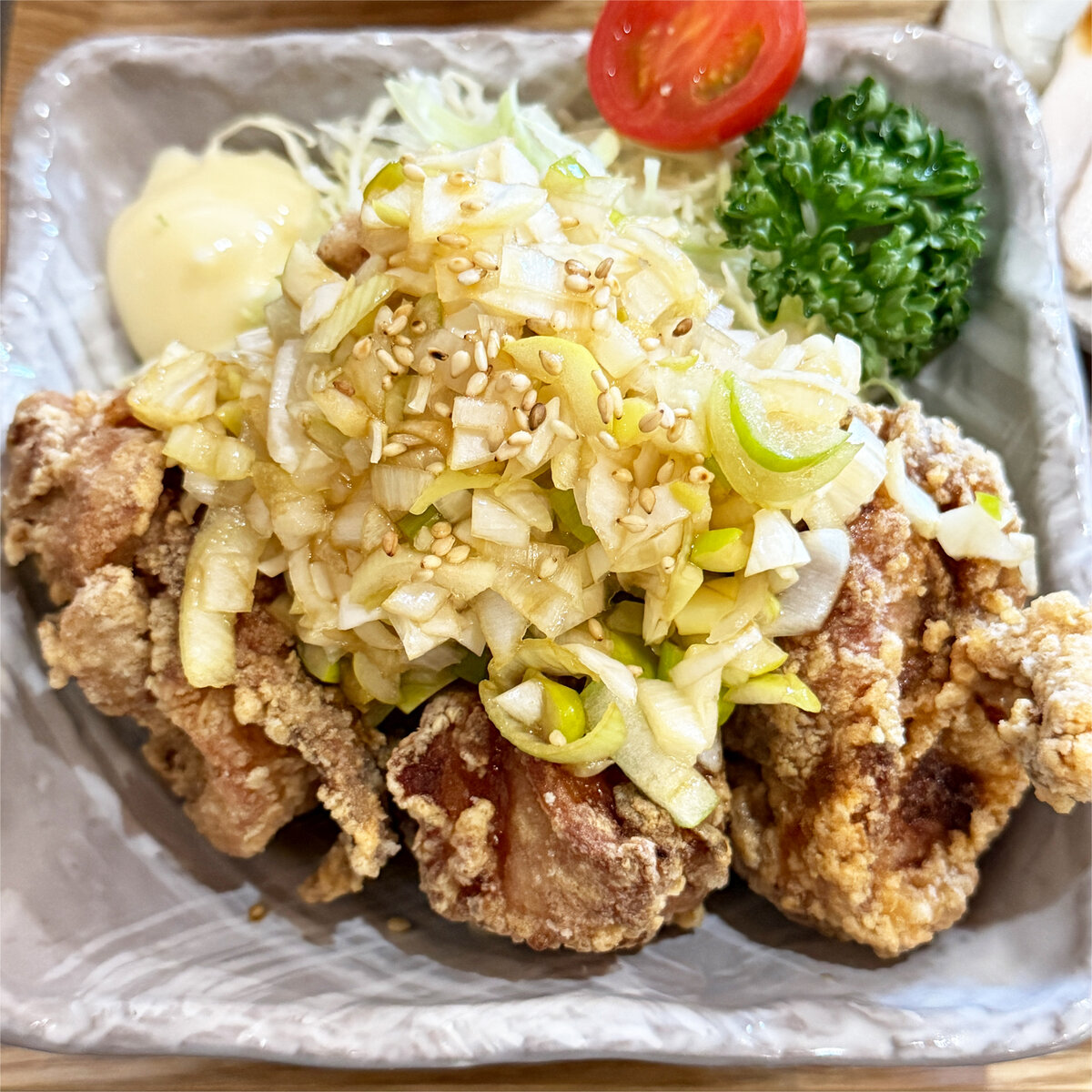 カラッと揚がった唐揚げにたっぷりのネギとたれがかかってます。