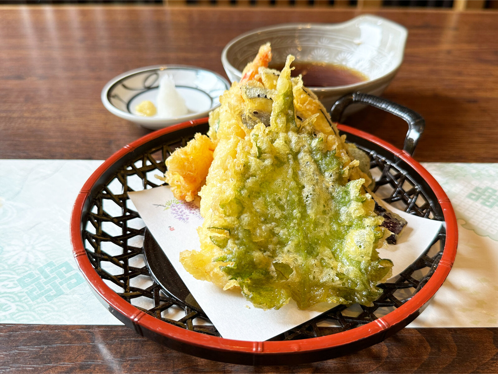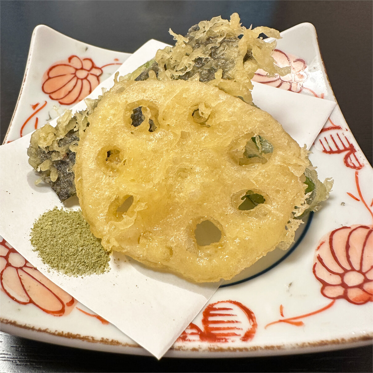 天ぷらも健在です。レンコン、海苔、ピーマンです。抹茶塩で頂きます。